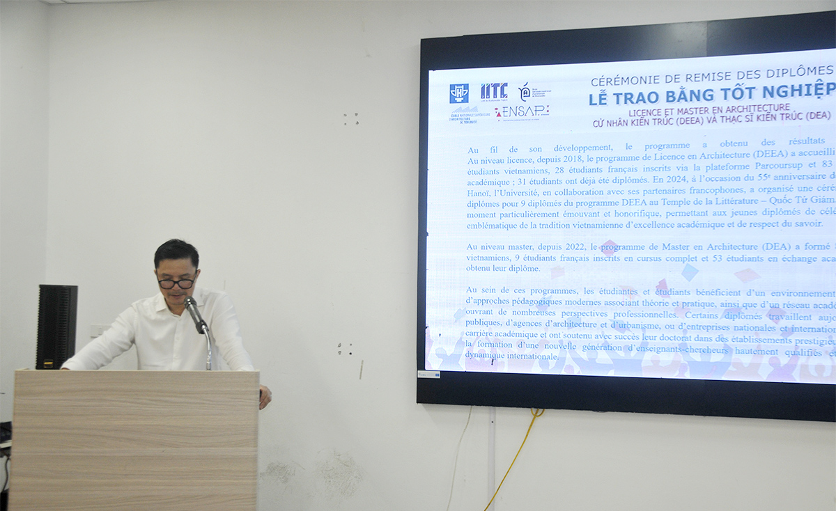 Là đơn vị luôn đồng hành cùng các chương trình liên kết của Nhà trường, ngài Nicolas Maïnetti - Giám đốc Tổ chức Đại học Pháp ngữ (AUF) khu vực châu Á - Thái Bình Dương cho biết: Những tấm bằng được trao tại buổi lễ (Bằng Cử nhân Kiến trúc do Trường Đại học Kiến trúc Quốc gia Normandie cấp và bằng Thạc sĩ Kiến trúc do Trường Đại học Kiến trúc Quốc gia Toulouse cấp) đều là các văn bằng danh giá của Cộng hòa Pháp, được Bộ Văn hóa Pháp công nhận và triển khai đào tạo ngay tại Hà Nội. Các chương trình này tập trung giải quyết những vấn đề đặc thù của khu vực như: quá trình chuyển đổi đô thị, phát triển bền vững, mối quan hệ giữa kiến trúc và cảnh quan, giữa bảo tồn di sản và tiến trình đổi mới.