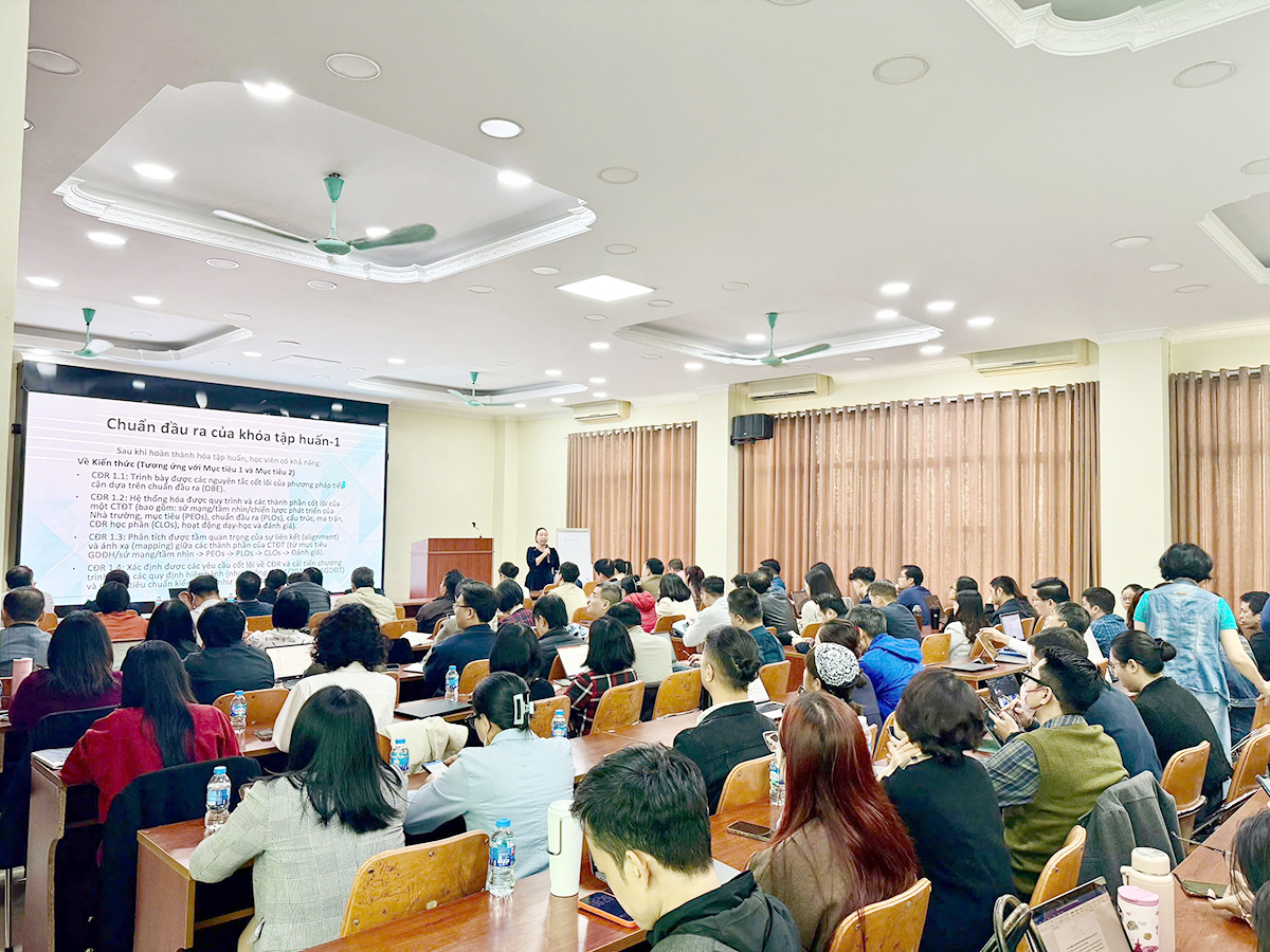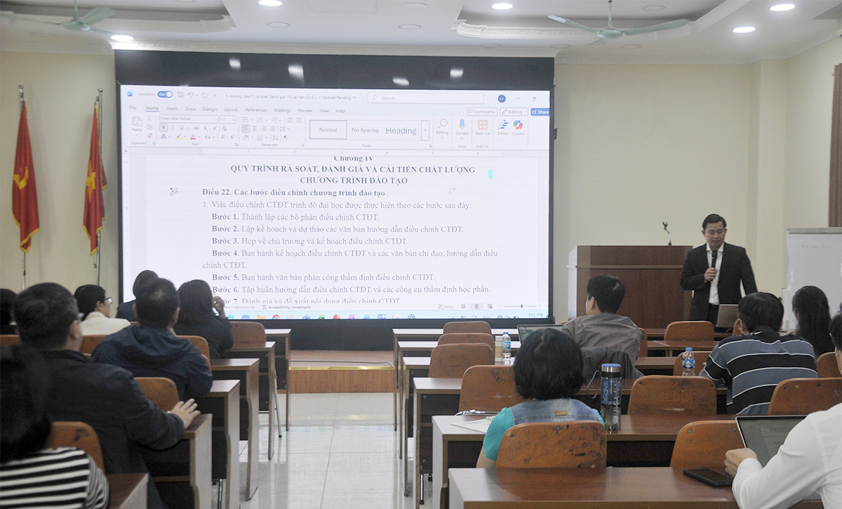Giai đoạn lý thuyết và hướng dẫn (từ ngày 02/12/2025 đến ngày 04/12/2025), chương trình tập huấn được thiết kế kết hợp giữa lý thuyết chuyên đề và thực hành theo 31 nhóm, tập trung vào các nội dung cốt lõi: Xây dựng mục tiêu và chuẩn đầu ra của chương trình đào tạo; xây dựng bản mô tả chương trình đào tạo và khung chương trình đào tạo dựa trên mục tiêu và chuẩn đầu ra; thực hành xây dựng đề cương chi tiết học phần theo mục tiêu và chuẩn đầu ra của chương trình đào tạo; thu thập ý kiến phản hồi của các bên liên quan, một yếu tố then chốt trong quy trình cải tiến chất lượng.