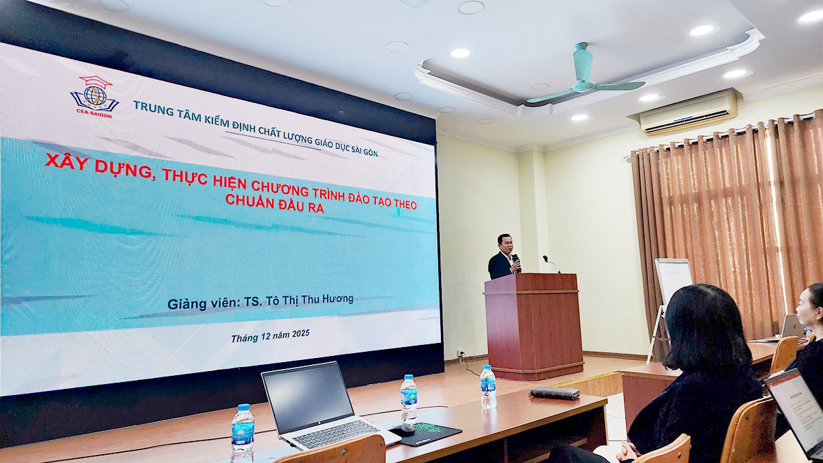 TS.KTS. Ngô Thị Kim Dung - Phó Hiệu trưởng Nhà trường nhấn mạnh những yêu cầu ngày càng khắt khe của các bộ tiêu chuẩn đánh giá chất lượng về chuẩn đầu ra chương trình đào tạo. TS.KTS. Ngô Thị Kim Dung mong muốn dưới sự hướng dẫn của các chuyên gia của CEA-SAIGON, cán bộ, giảng viên của Nhà trường sẽ được trang bị kiến thức, kỹ năng về việc xây dựng chương trình đào tạo theo đúng tinh thần của Thông tư 04/2025/TT-BGDĐT của Bộ Giáo dục và Đào tạo vừa ban hành để năm 2026 Nhà trường sẽ thực hiện đợt rà soát, đánh giá, cập nhật chương trình đào tạo đảm bảo đáp ứng các yêu cầu theo quy định hiện hành.