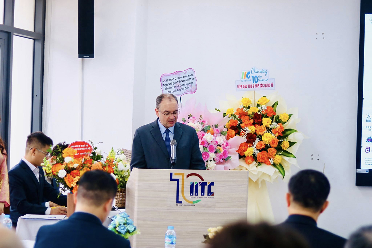 Thay mặt Đại sứ quán Cộng hòa Pháp tại Việt Nam, ngài Eric Soulier bày tỏ vinh dự được tham dự Lễ kỷ niệm 10 năm thành lập Viện ngay trước Ngày Nhà giáo Việt Nam 20/11. Ông khẳng định các chương trình liên kết đào tạo Pháp ngữ tại Trường Đại học Kiến trúc Hà Nội là duy nhất tại Việt Nam và là minh chứng rõ nét cho mối quan hệ hợp tác hiệu quả. Các chương trình liên kết đào tạo Cử nhân và Thạc sĩ Kiến trúc với ENSA Normandie và ENSA Toulouse, cũng như chương trình đào tạo Tiến sĩ triển khai từ năm 2015 với sự hỗ trợ của AUF và Đại sứ quán Pháp, đã mang đến cho sinh viên cơ hội tiếp cận trực tiếp bằng cấp Pháp và chuẩn mực học thuật cao. Trong đó, vai trò của TS. KTS. Nguyễn Thái Huyền – Phó Viện trưởng – được đánh giá đặc biệt quan trọng và đã được ghi nhận bằng Huân chương Cành cọ Hàn lâm của Cộng hòa Pháp.