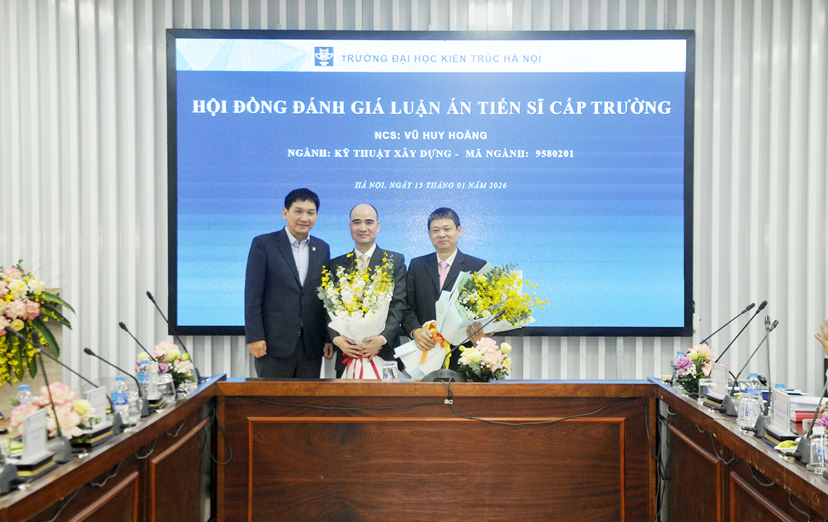 Hội đồng đánh giá Luận án Tiến sĩ cấp Trường cho NCS Vũ Huy Hoàng được thành lập theo Quyết định số 269/QĐ-ĐHKT-SĐH ngày 25/11/2025 của Hiệu trưởng Trường Đại học Kiến trúc Hà Nội gồm 07 thành viên do PGS.TS Vũ Hoàng Hiệp - Trường Đại học Kiến trúc Hà Nội làm Chủ tịch Hội đồng; PGS.TS Vũ Anh Tuấn - Trường Đại học Xây dựng Hà Nội (phản biện 1); GS.TS Nguyễn Tiến Chương - Trường Đại học Thuỷ lợi (phản biện 2); TS Phạm Thanh Hùng - Trường Đại học Kiến trúc Hà Nội (phản biện 3); PGS.TS Vũ Thanh Thuỷ - Trường Đại học Kiến trúc Hà Nội (uỷ viên thư ký); PGS.TS Phạm Văn Phê - Trường Đại học Giao thông vận tải (uỷ viên) và PGS.TS Nguyễn Văn Tú - Học viện Kỹ thuật quân sự (uỷ viên).